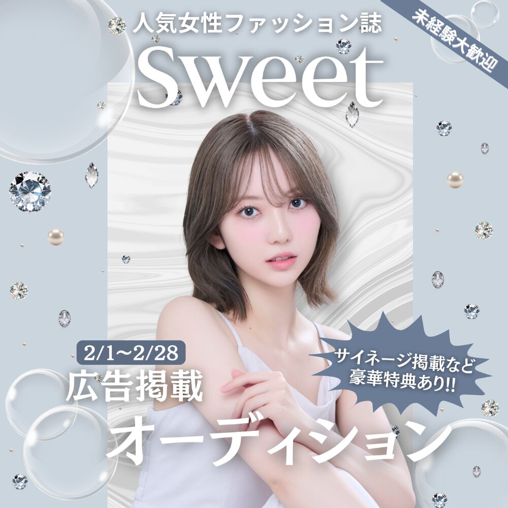 『sweet広告掲載オーディション』は、人気女性ファッション誌『sweet』での広告掲載をはじめ、都内サイネージ掲出、プロヘアメイク・カメラマンによる撮影など、参加者の魅力を最大限に引き出す特別なプロ
