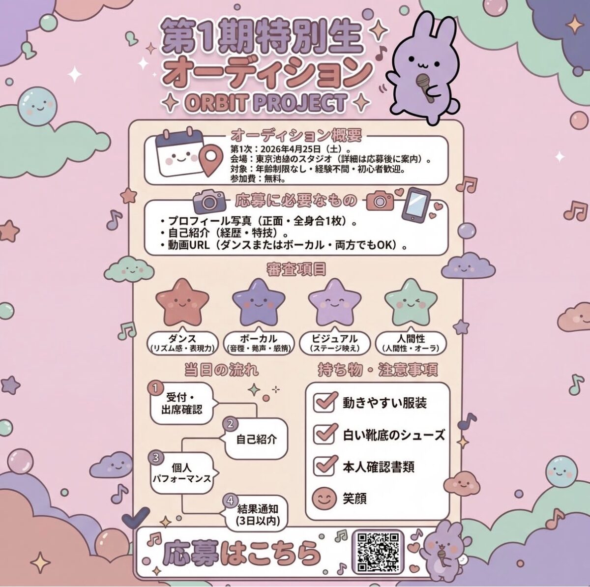 合格者は特待生として、レッスン費用免除のうえ、プロフィール撮影、スタジオレコーディング、MV撮影、公式音源配備、K-POPライブ・イベント出演まで、すべてを現場で経験しながらデビューを目指します。